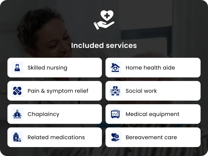 Skilled nursing, home health aide, social work, chaplaincy, pain/symptom management, medical equipment delivery, medications related to the terminal diagnosis, and bereavement support.